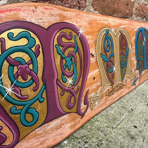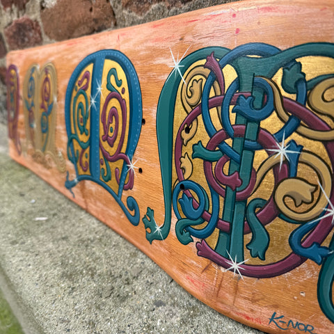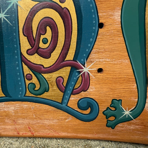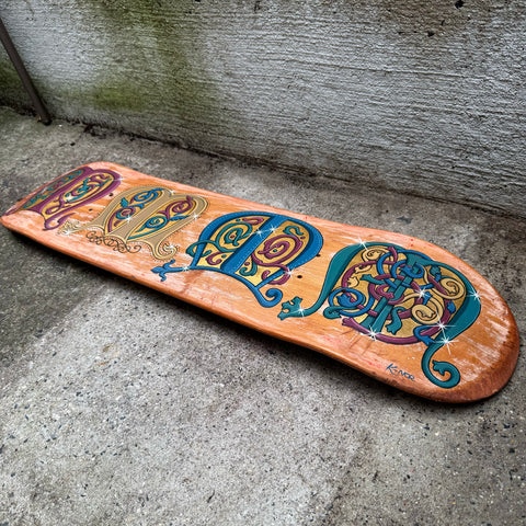 Acrylic, stain and real gold leaf on wood skateboard deck