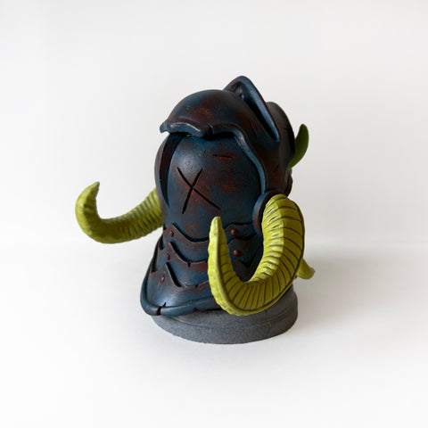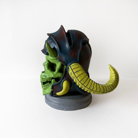 ‘Warrior Skull’ is a dimensional realization of K-NOR’s helmeted skull character, a recurring motif in both his street art and personal work. With a battered and rusted helmet, majestic ram horns and evocative battle cry, ‘Warrior Skull’ is sure to entice anyone in the mood to hear a good war story.